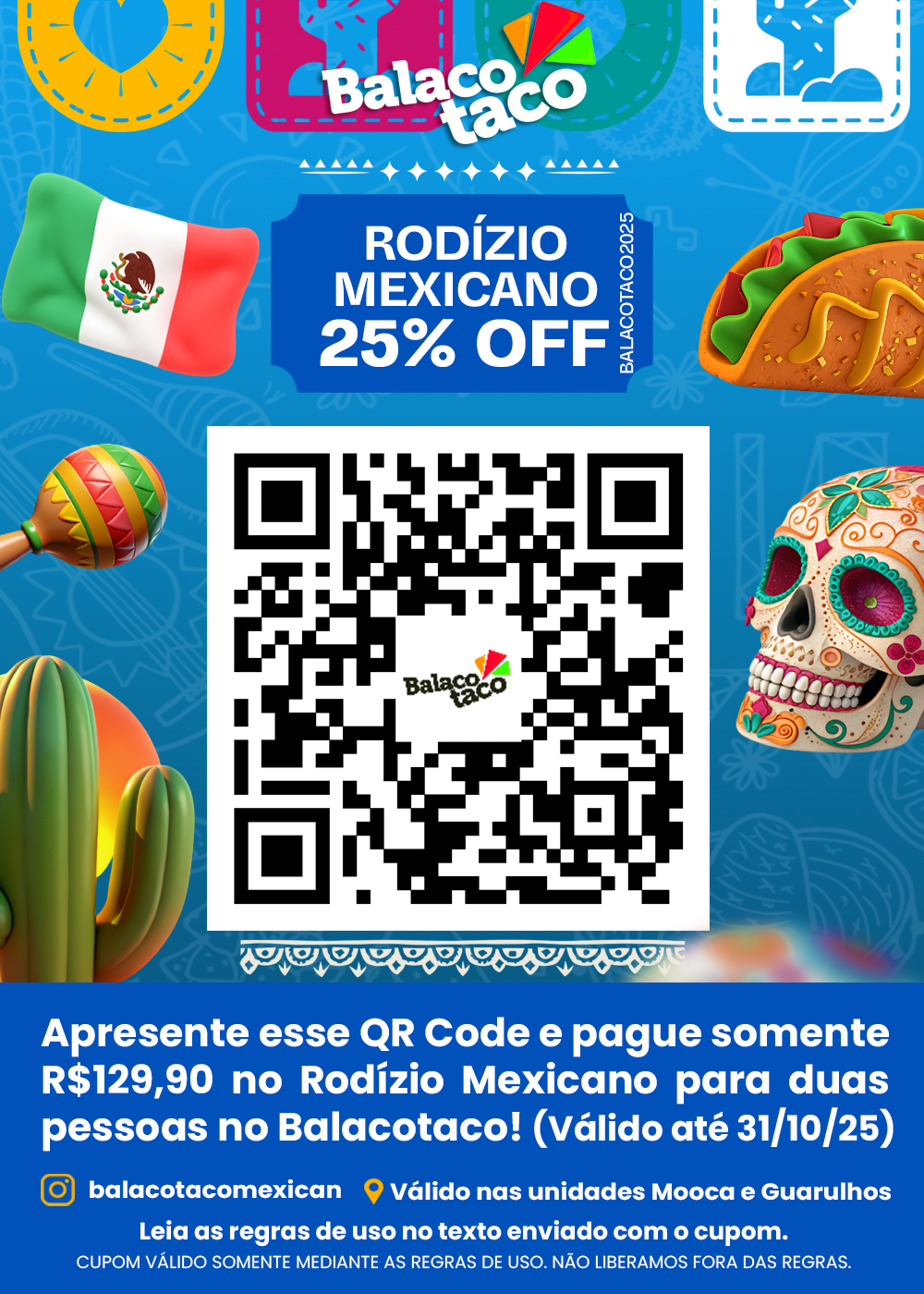 Parabéns, você acaba de resgatar o cupom de RODÍZIO MEXICANO PARA DUAS PESSOAS POR R$129,90 do Balacotaco! Leia as regras de uso abaixo do cupom e bom apetite!